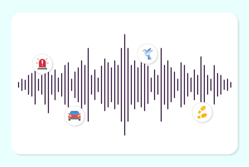 Identifies and labels specific sounds such as footsteps, alarms, sirens, or machinery noises, enabling AI to differentiate between various sound sources.