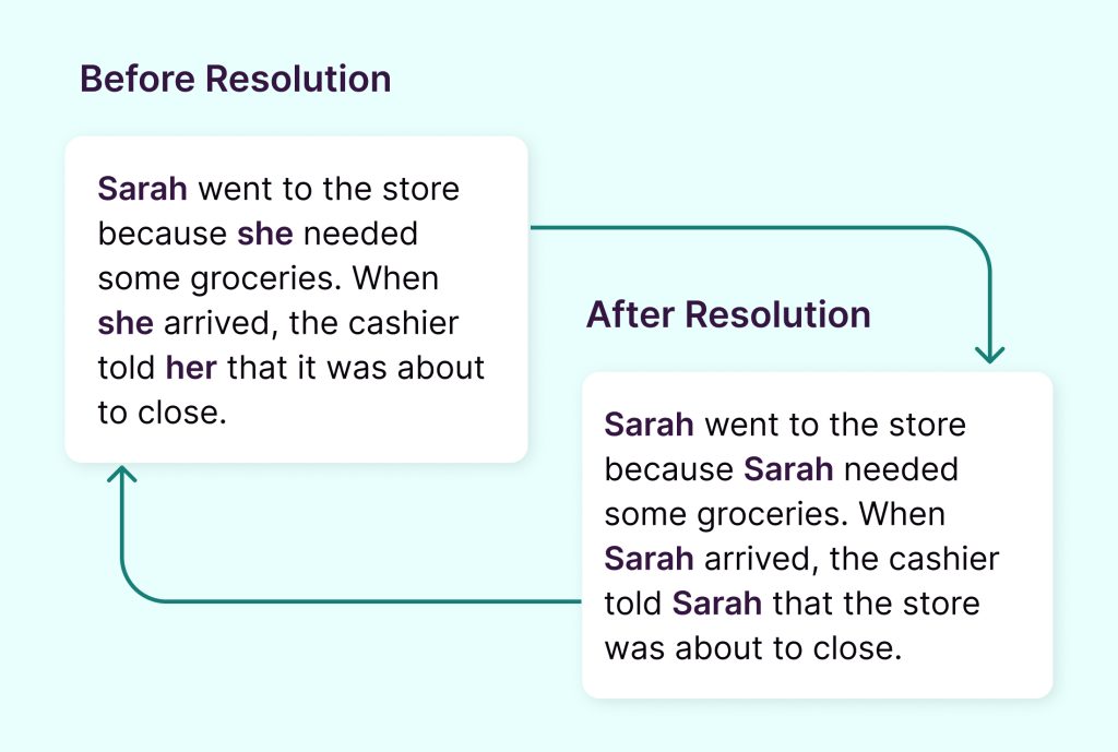 Connects pronouns, names, or references to their original entities, improving AI’s understanding of relationships and context.