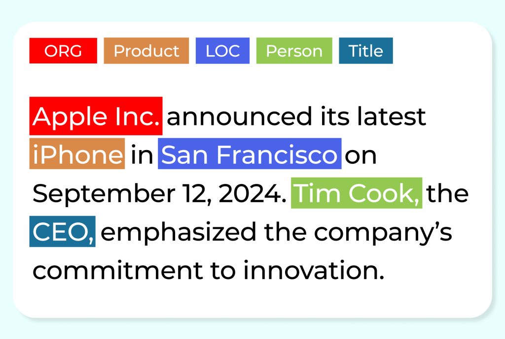 Identifies and labels named entities within text, such as people, places, organizations, and dates.
